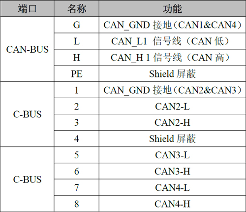 GCAN-GT-414模块CAN-bus接口由3个4 Pin接线端子引出,可以用于连接4个CAN-bus网络或者CAN-bus接口的设备,其接口定义如下表所示。