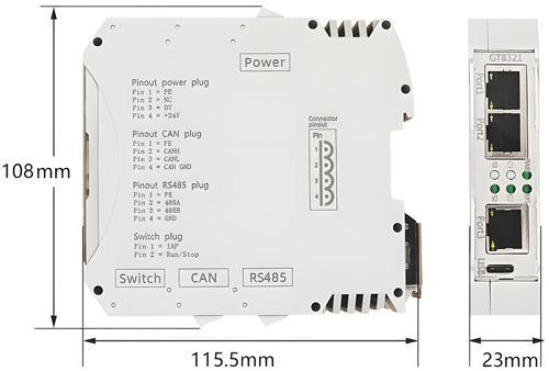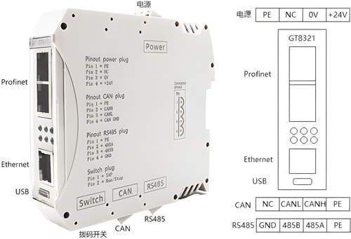 GCAN-GT-8321-PROG型号,硬件上集成全部接口,包括1路电源接口、2路Profinet接口、1路以太网接口、1路CAN总线接口及1路RS485总线接口。