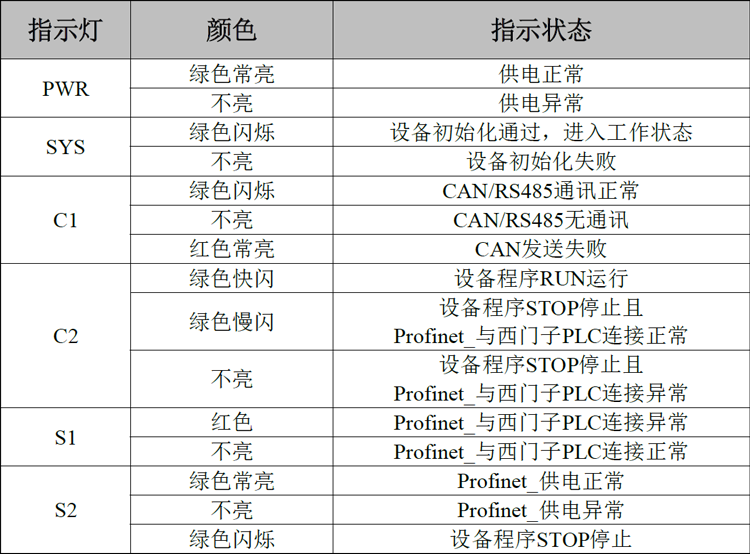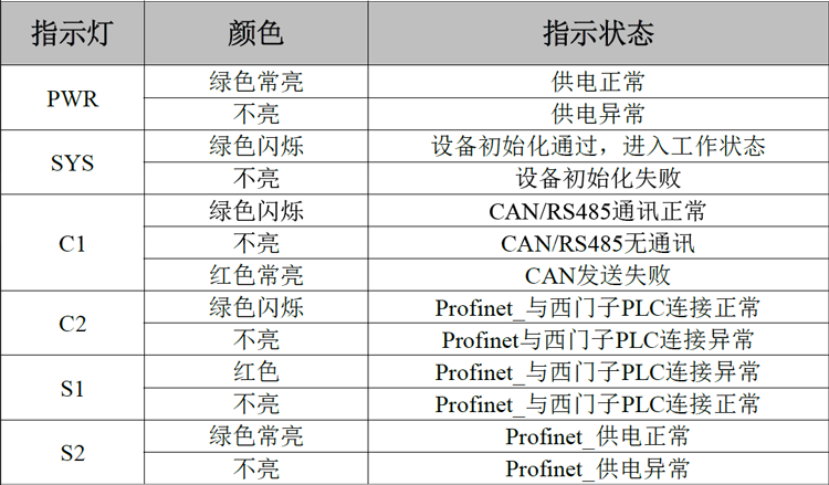 GCAN-GT-8321的正面突出区域包含6个圆形状态指示灯。指示灯的具体指示功能及不同状态下时,GCAN-GT-8321模块状态如表2.4、表2.5所示。
