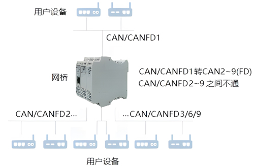 ● GCAN-GT-418网桥系列产品。CAN/CANFD1作为主节点,CAN/CANFD2~3/2~6/2~9作为从节点,每个从节点最多可以带32个CAN设备。主节点和从节点的波特率可以自由配置,实现CAN/CANFD网络的网桥功能,可以将不同速率的CAN/CANFD网络数据转发到CAN/CANFD1通道;