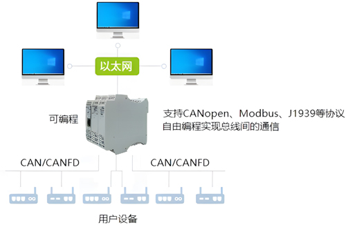 ● GCAN-GT-418可编程系列产品,具有CAN/CANFD总线接口,1路以太网接口。支持CANopen、Modbus、J1939等协议,支持CAN/CANFD自由口,通过自由编程,可以实现不同总线接口之间数据的互相通信转换。