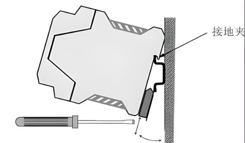 GCAN-GT-418系列模块安装方法如图2.2所示,可使用一字螺丝刀辅助将模块安装到DIN导轨上。