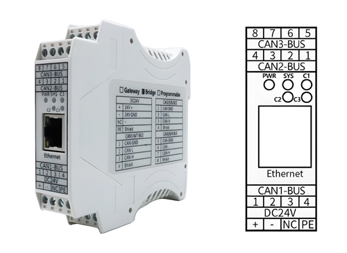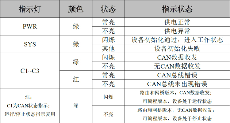 GCAN-GT-418-3系列模块具有1个PWR指示灯、1个SYS指示灯、3个CAN总线状态指示灯。