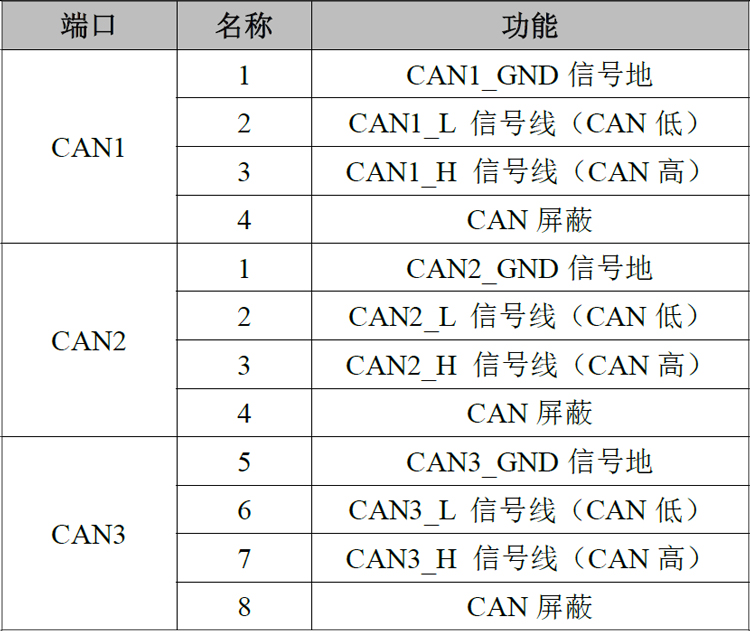 GCAN-GT-418-3系列模块CAN/CANFD接口由3个4Pin接线端子引出,有3个独立的CAN/CANFD接口,其接口定义如表2.2所示。