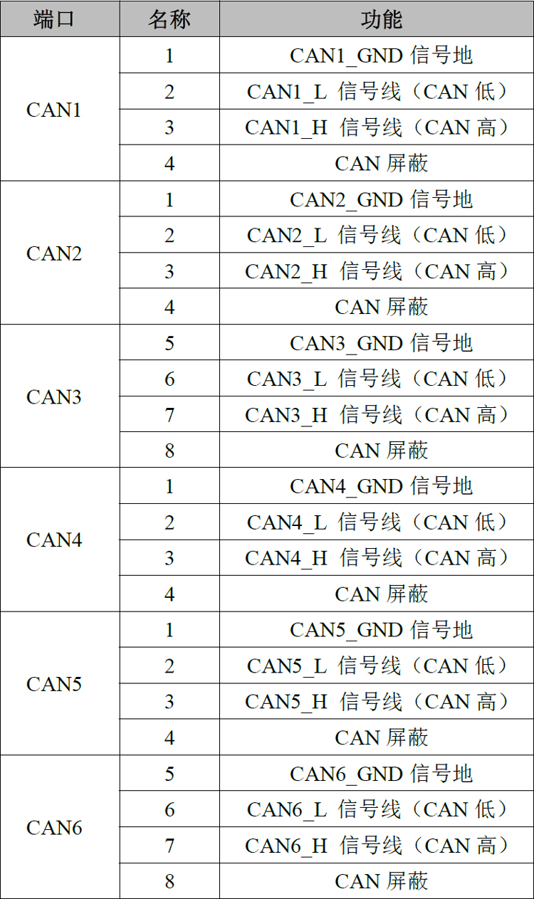 GCAN-GT-418-6系列模块CAN/CANFD接口由6个4Pin接线端子引出,有6个独立的CAN/CANFD接口,其接口定义如表2.5所示。