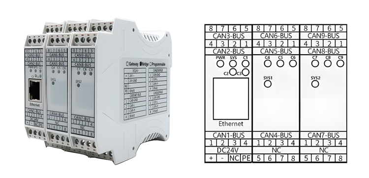 GCAN-GT-418-9系列模块具有1个PWR指示灯、3个SYS指示灯、9个CAN总线状态指示灯。