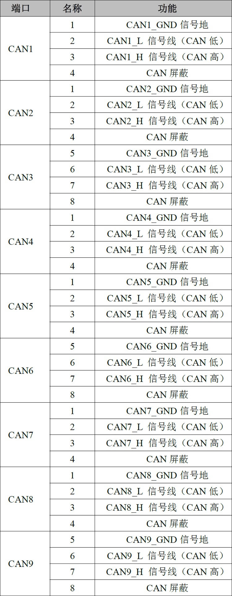 表2.8 GCAN-GT-418-9系列模块的CAN信号分配