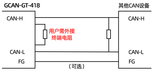 请注意:GCAN-GT-418系列模块的CAN总线内部未集成120Ω终端电阻。如果节点数目大于2,中间节点不需要安装120Ω的终端电阻。需要使用时,将电阻两端分别接入CAN_H、CAN_L即可,如图3.2所示。