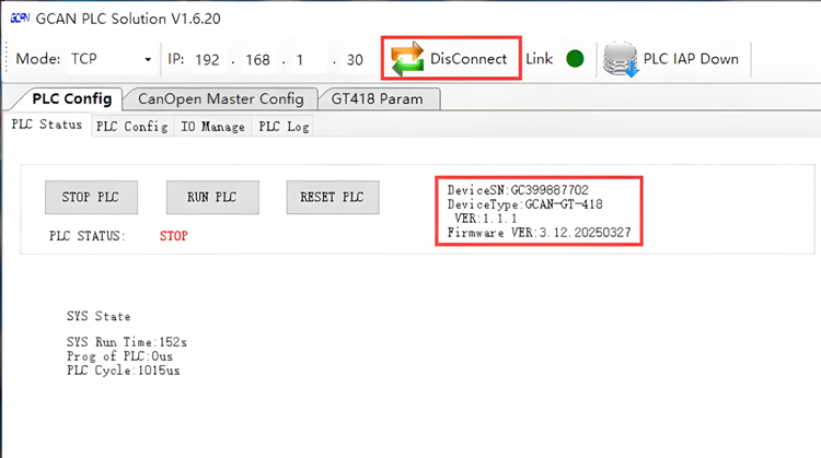 1)打开GCAN_PLC_Solution软件,Mode选择TCP模式,418的网口连接上位机,输入418的IP地址(出厂默认192.168.1.30),点击“Connect”按钮。连接成功后会显示418的相关参数信息。