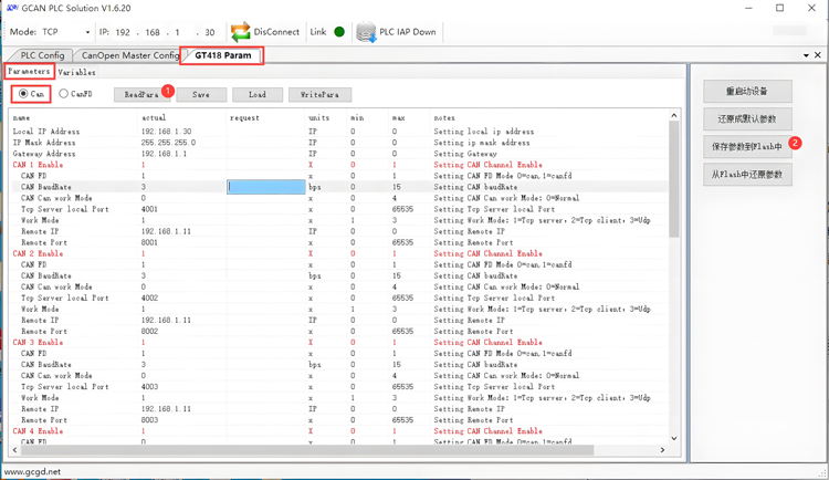 2)点击“GT418 Param”标签页。选择配置“Can模式”或“CanFD模式”,这里以Can模式为例,“ReadPara”可以获取当前418设备内的参数,包括波特率、Tcp模式、目标IP等参数,在“request”列写入想修改的参数后,点击右侧“保存参数到Flash中”,“重启动设备”或设备手动重启后配置生效;