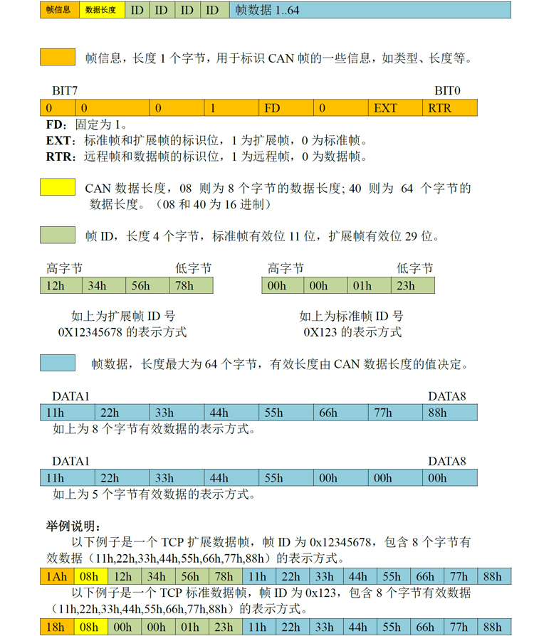 以太网与CAN FD总线数据流定义一条CAN帧包含70个字节,不足70字节,模块会自动将不足位填补齐。
