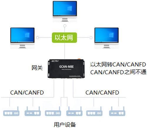 ● 网关系列GCAN-M8E产品,具有8个电气隔离的CAN/CANFD总线接口,1路以太网接口。以太网具有TCP Server,TCP Client,UDP等多种工作模式,是高性能的工业级以太网与CAN/CANFD的数据转换设备;