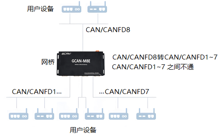 ● 网桥系列GCAN-M8E产品,具有8个电气隔离的CAN/CANFD总线接口,1路以太网接口。CAN/CANFD8作为主节点,CAN/CANFD 1~7作为从节点,每个从节点最多可以带32个CAN设备。主节点和从节点的波特率可以自由配置,实现CAN/CANFD网络的网桥功能,可以将不同速率的CAN/CANFD网络数据转发到CAN/CANFD8通道;