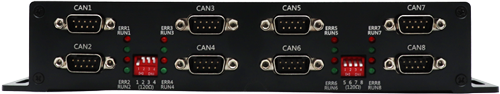 请注意:GCAN-M8E内部已集成120Ω终端电阻,可通过拨码开关选择是否将电阻接入总线,拨码开关在DB9接口侧,四条通道中间的拨码开关R1~R8分别控制对应的八条通道。