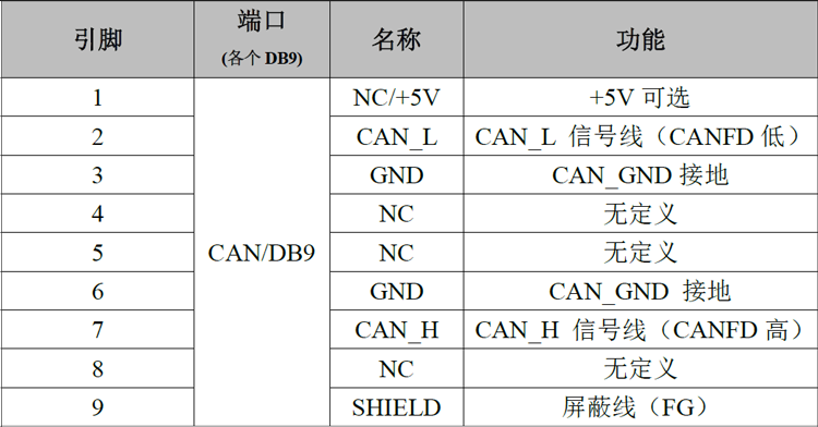 表2.2 GCAN-M8E接口卡的CANFD-Bus信号分配