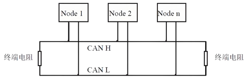 CAN网络采用直线拓扑结构,总线最远的2个终端需要安装120Ω的终端电阻;如果节点数目大于2,中间节点不需要安装120Ω的终端电阻。对于分支连接,其长度不应超过3米。CAN总线的连接如图3.1所示。