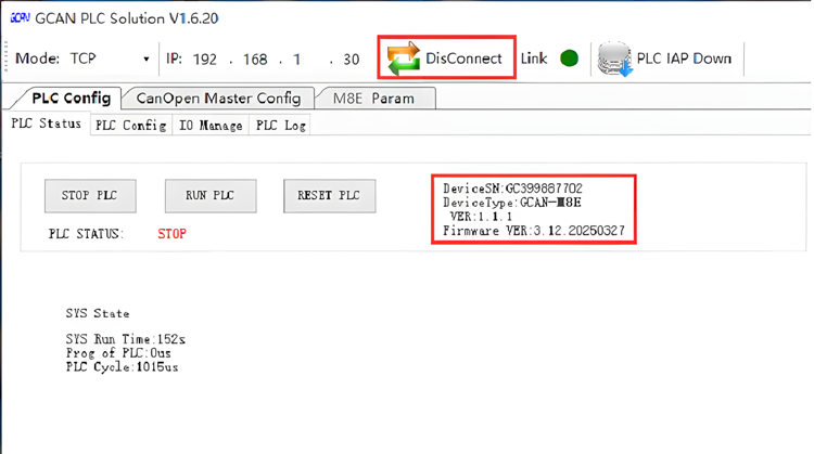 1)打开GCAN_PLC_Solution软件,Mode选择TCP模式,GCAN-M8E的网口连接上位机,输入GCAN-M8E的IP地址(出厂默认192.168.1.30),点击“Connect”按钮。连接成功后会显示GCAN-M8E的相关参数信息。