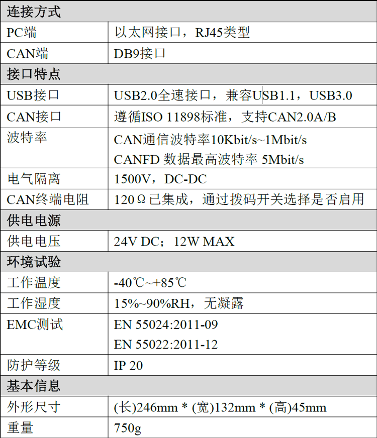 ● 浪涌抗扰度等级:CAN总线接口±4KV;