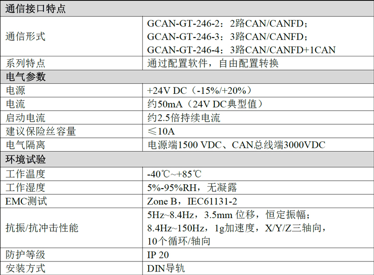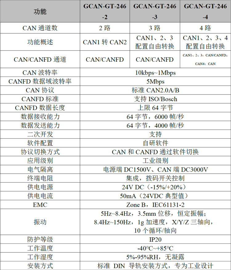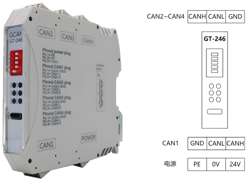 GCAN-GT-246-2集成CAN1和CAN2接口;GCAN-GT-246-3集成CAN1、CAN2和CAN3接口;GCAN-GT-246-4集成CAN1、CAN2、CAN3和CAN4接口;