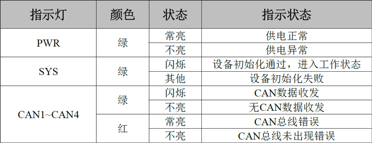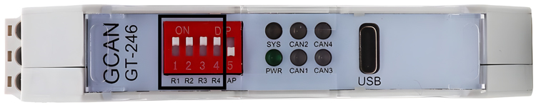GCAN-GT-246模块具有1个PWR指示灯、1个SYS指示灯、4个CAN总线状态指示灯。