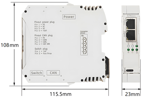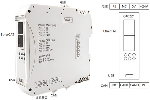 GCAN-GT-8221模块集成1路24V DC电源接口、2路标准EtherCAT接口、、1路标准CAN-Bus接口,GCAN-GT-8221模块接线端子排如图2.3所示。