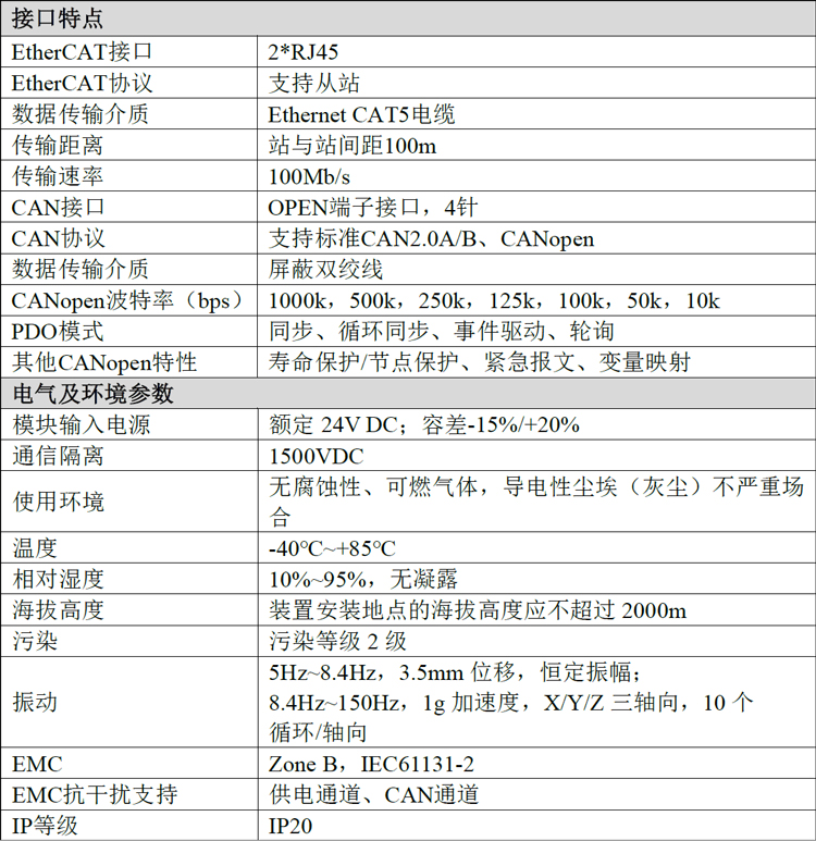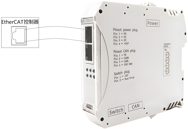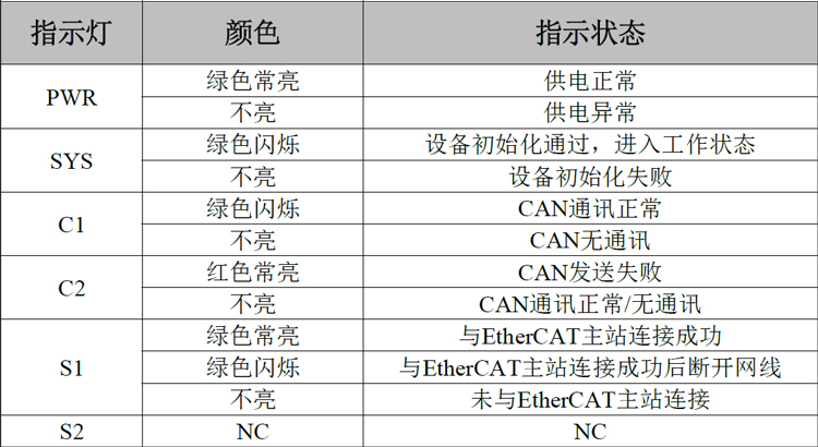 (1)2个EtherCAT总线接口,EtherCAT/IN和EtherCAT/OUT(RJ45);