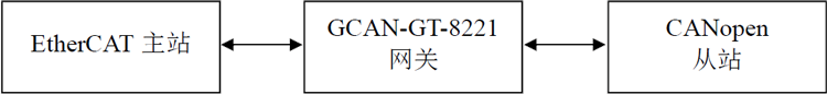 EtherCAT总线主站的EtherCAT接口连接8221的EtherCAT接口,8221的CAN接口连接CANopen从站的CAN总线接口。