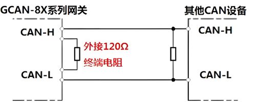 请注意:GCAN-GT-8221的CAN总线内部未集成120Ω终端电阻。如果节点数目大于2,中间节点不需要安装120Ω的终端电阻。需要使用时,将电阻两端分别接入CAN_H、CAN_L即可,如图4.4所示。