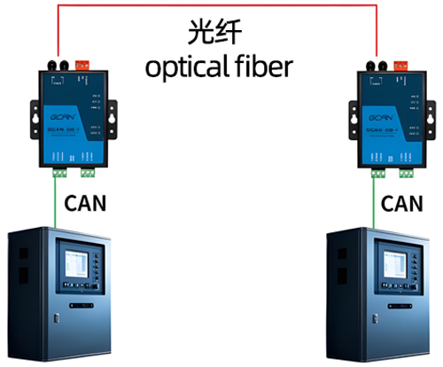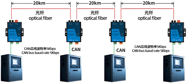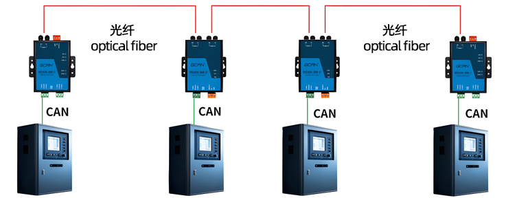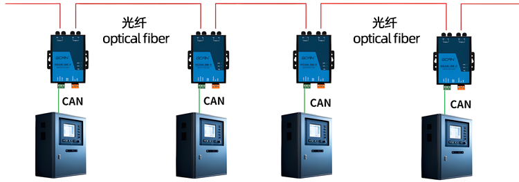 (2) The GCAN-208 series fiber optic supports relay expansion for CAN bus networks, with a transmission distance of 20km; supports CAN bus networks with different baud rates, with CAN baud rates ranging from 5Kbps to 1Mbps; Supports any CAN bus communication protocol such as CANopen, SAE J1939, DeviceNet, NMEA2000, etc.