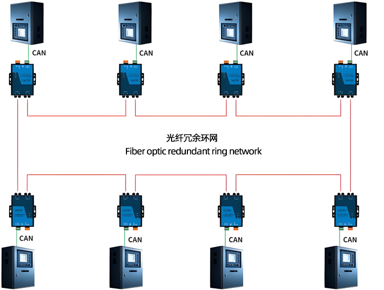 Note: When using GCAN-208-2 F in the ring network, if a single device or a section of the line fails, it will not affect other devices in the system, ensuring stable and reliable operation of the system.