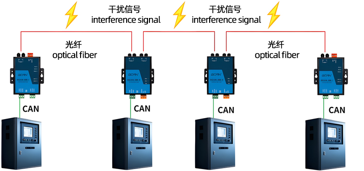 (1) The GCAN-208 series optical fiber can completely isolate interference, avoiding lightning strikes, surges, electromagnetic interference, etc. from being introduced from twisted pair cables.