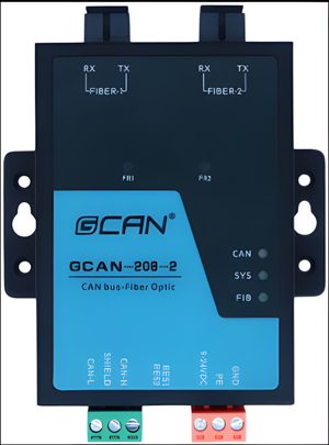 沈阳广成科技GCAN-208-2-FA工业级CAN光纤转换器,集成1路CAN总线接口与2路标准光纤接口(单模/多模可选,接口类型可选SC/ST/FC)。