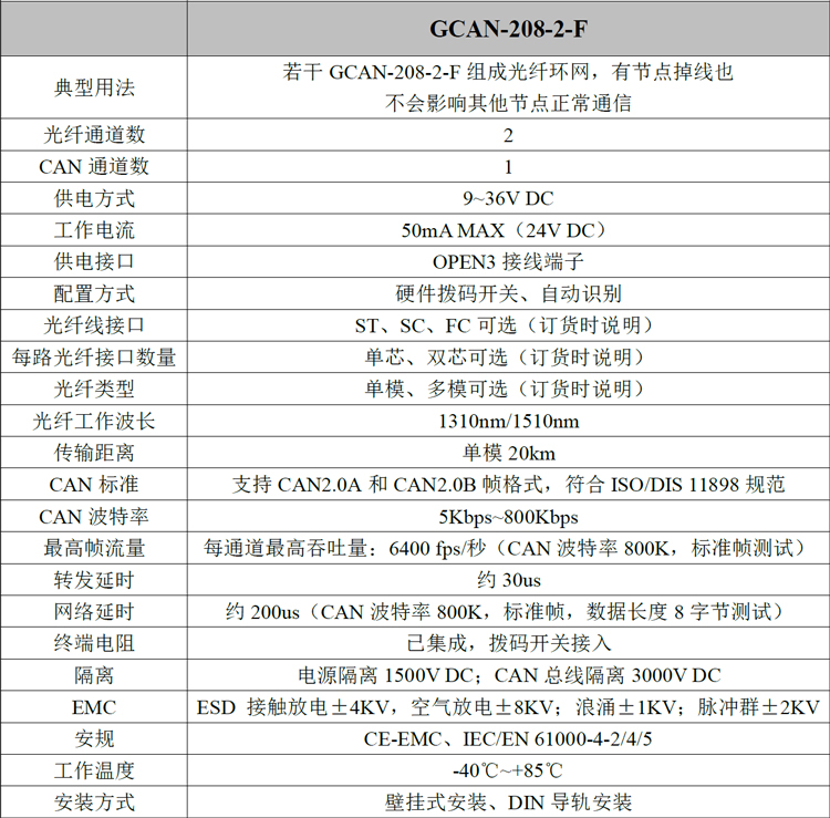 1.6 Features(1)GCAN-208-2-F系列光纤可以彻底隔离干扰,避免雷击、浪涌、电磁干扰等从双绞线导入。