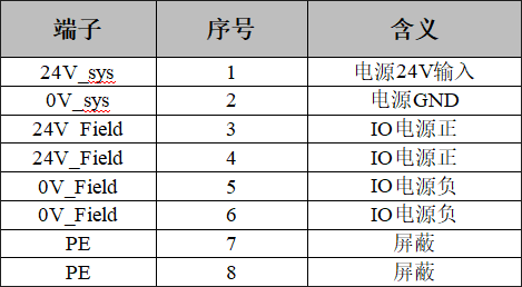 GCAN-IO-8100 Modbus总线耦合器的接线端子排如上图所示。GCAN-IO-8100 Modbus总线耦合器包含8个端子,各个端子对应的序号及其含义如下表所示。请注意,3号端子与4号端子之间、5号端子与6号端子之间、7号端子与8号端子之间,在模块的内部是相连的。