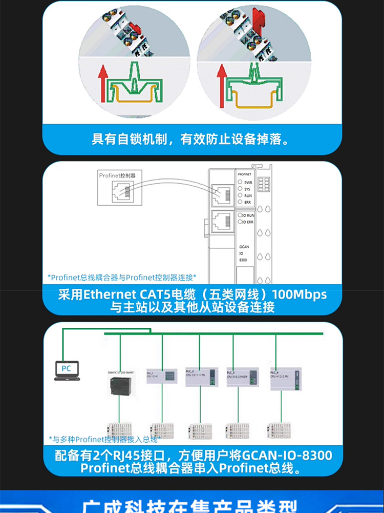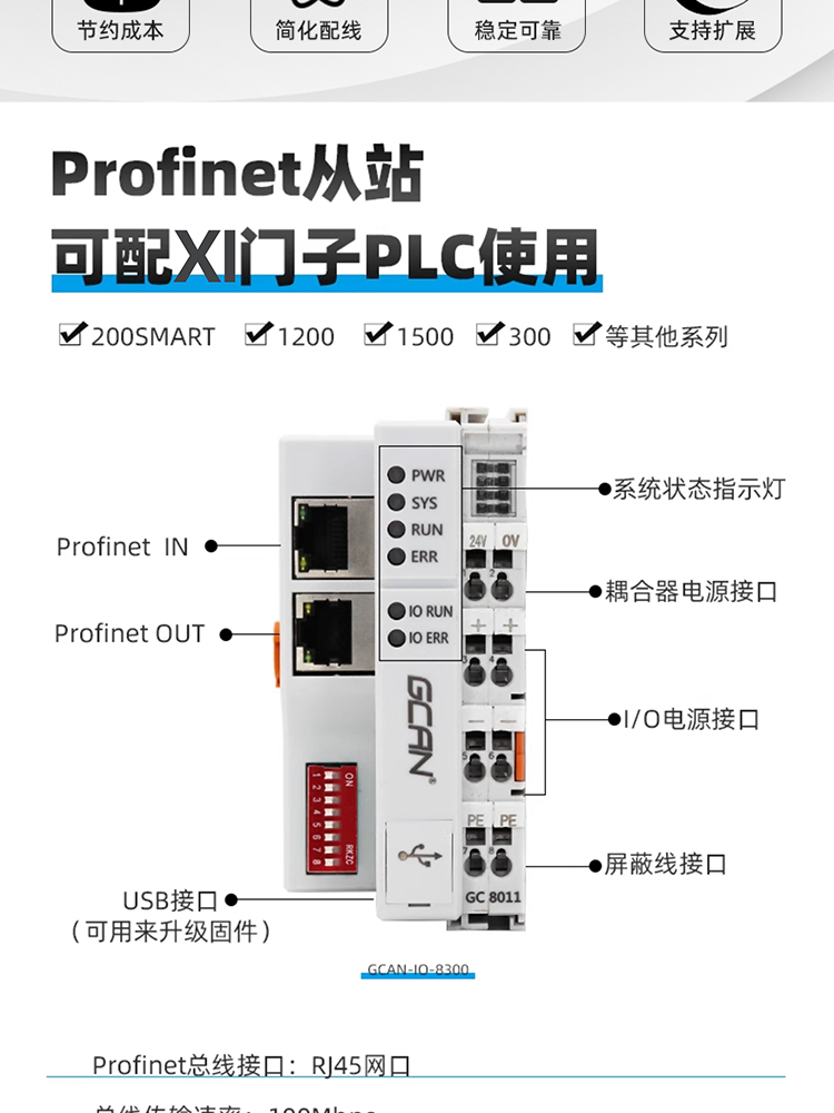 - GCAN-IO-8300 Profinet总线耦合器是我公司推出的基于Profinet总线自主研发的高性能总线通用远程IO模块,为用户节约成本,简化配线,提高系统可靠性,这些IO端子模块可以通过模块化的方式进行扩展。一个完整的节点由一个总线耦合器、1-32个任意数量的端子模块以及一个终端端子模块组成。采用GCAN-IO-8300 Profinet总线耦合器,通过GC-bus扩展技术,可极为方便地建立I/O连接,最多可连接32个输入/输出端子模块。此系列IO特别适用于现场点数多,信号种类多集中控制。