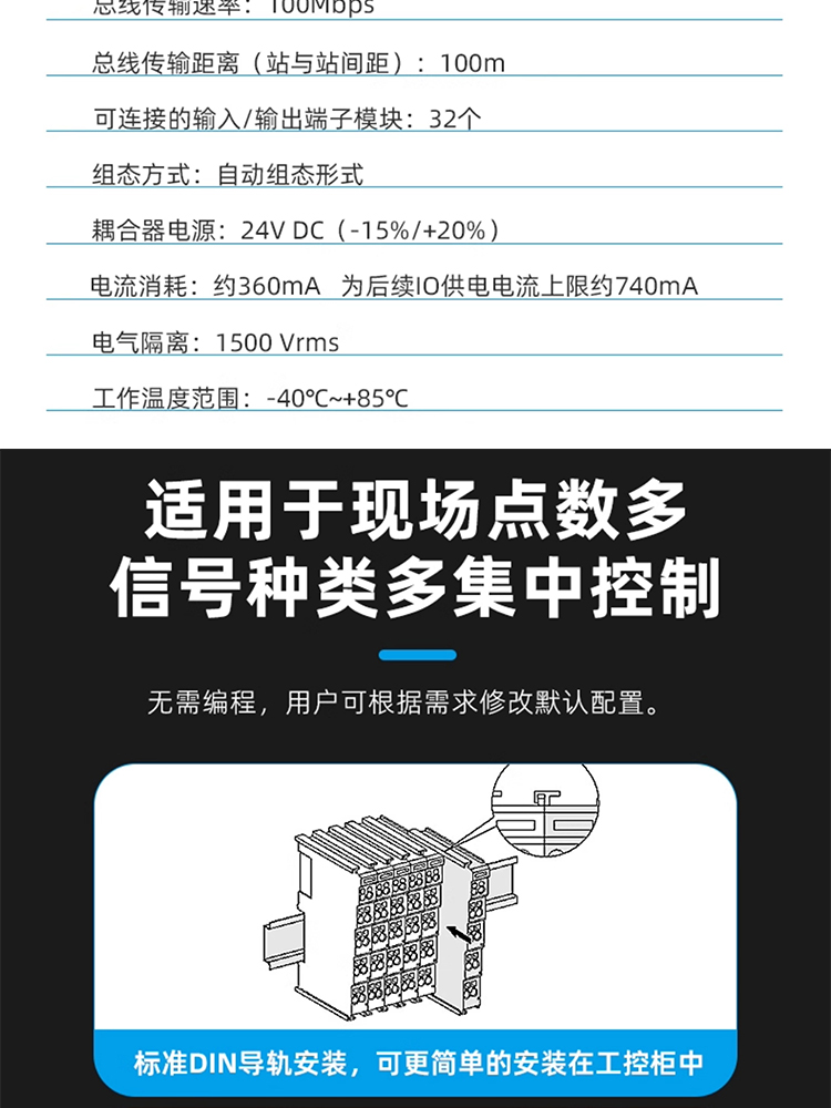 (1)2个Profinet总线接口(RJ45);(2)总线传输速率:100Mbps;(3)总线传输距离(站与站间距):100m;(4)总线端子模块数量最多为32个;(5)组态方式为自动组态形式;(6)电源采用24V DC(-15%/+20%);(7)电流消耗约360mA;(8)为后续IO供电最大电流约740mA;(9)电气隔离为1500 Vrms;(10)工作温度范围:-40℃~+85℃;(11)尺寸:长100mm*宽69mm*高48mm。- GCAN-PLC产品功能及应用视频:
