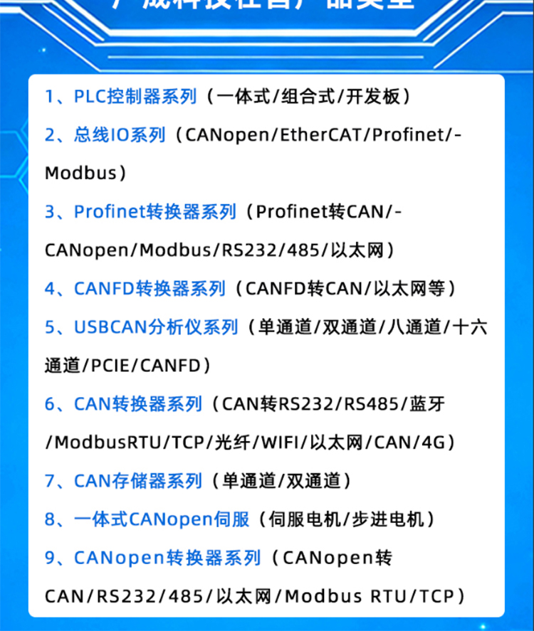 1、一体式PLC控制器系列2、组合式PLC控制器系列3、PLC开发板4、一体式总线IO耦合器5、组合式总线IO耦合器6、插片式IO扩展模块