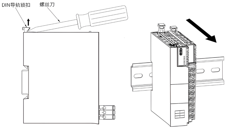 如图2.3所示,使用一字螺丝刀或类似工具向上撬动导轨锁扣,在凸起部位将模块向外拉出,将模块取出。