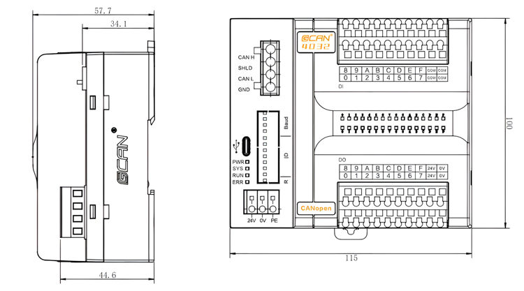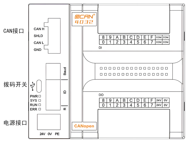 GCAN-4032 CANopen远程IO模块是我公司推出的基于CANopen总线自主研发的高性能总线通用远程IO模块,为用户节约成本,简化配线,提高系统可靠性,系统自带16路DI和16路DO(输出默认晶体管PNP型,可选NPN型;输入可通过接线切换源/漏型)。采用GCAN-4032模块,用户可用于采集数字量输入信号,并输出数字量信号,控制开关,实现远程开关设备和CANopen网络之间的连接,构成CANopen网络中数据量信号采集、输出的控制节点。