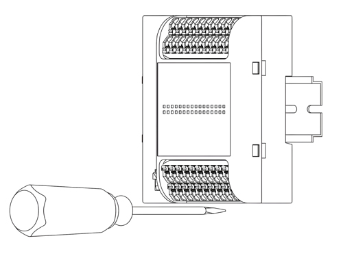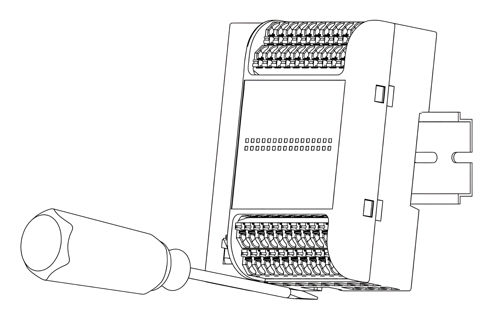 先将模块下方的导轨卡扣用一字螺丝刀拉出;然后将模块挂到DIN 导轨上,并使用一字螺丝刀将下方的导轨卡扣推进去锁定,如图所示:
