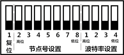 如图4.1所示,拨码开关的每个位拨向“ON“位置时,该位为“1”,如果拨向“OFF”位置,则该位为“0”。拨码开关的2-8位用于设定模块的节点号(MAC ID),第八位为最低位,第二位为最高位,模块的节点号(MAC ID)是各位对应的十进制值之和,通过拨码开关设定模块的节点号(MAC ID)的有效范围为0~127。