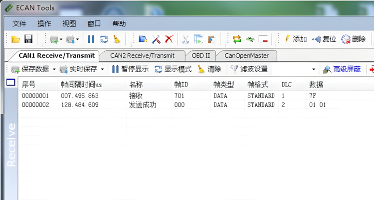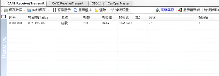 接收到NMT指令之后,GCAN-4032将开始广播PDO数据,并发出帧ID为0x701,帧数据为0x05的心跳指令,说明GCAN-4032已进入操作状态。
