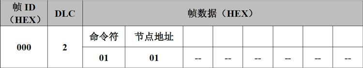 GCAN-4032模块接收由主站发出的操作指令,帧ID为0x000,DLC为2,帧数据第一个字节为命令符,第二个字节为节点号(00则为全部节点)。