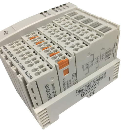 GCAN-PLC-510系列产品由一个可编程的主控模块(GCAN-PLC-510)、若干GC系列IO模块以及一个终端电阻模块(GC-0001)组成。GCAN-PLC-510等主控模块可连接所有的GC系列IO模块,用户可根据现场实际需求自行选择扩展IO模块,在电源供应充足情况下,IO模块数量最多可扩展32个,其中当扩展模块数量超过16片时,需额外增加一片IO供电扩展模块GC 8012以保证电源供应充足,主控模块可根据插入IO模块的前后位置自动分配地址,实现自动组态,用户无需在PC上创建组态界面及设置参数。
