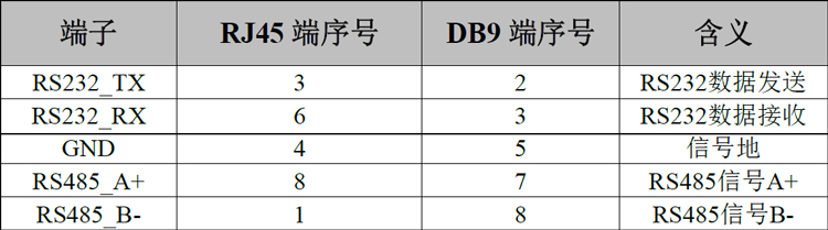 GCAN-PLC-510的主控模块由总线通信模块与供电模块组成。总线通信模块上集成了一路以太网接口、一路RS232/485复用接口、一路CAN总线接口,其分别使用RJ45接口、RJ45接口、4P端子接口引出。RS232与RS485接口样式如图2.6所示,其接口定义如表2.1所示;CAN总线接口样式如图2.7所示,其接口定义如表2.2所示。