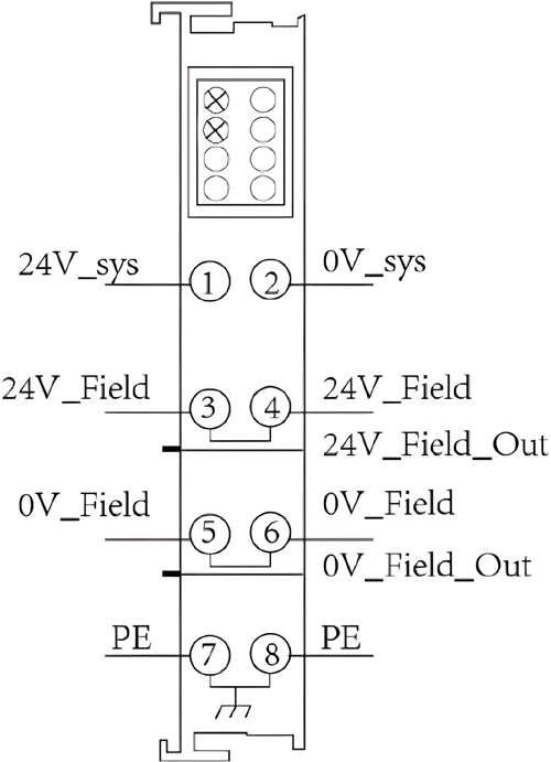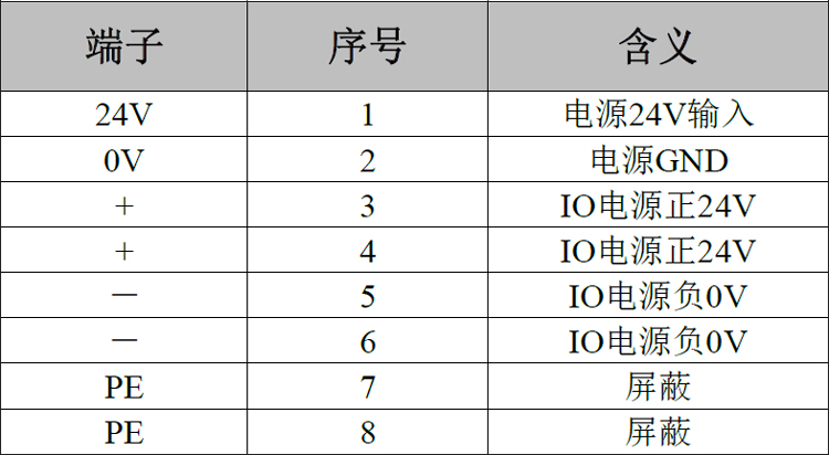 GCAN-PLC-510的电源接线端子排如图2.8所示,其接口定义如表2.3所示。GCAN-PLC-510可编程逻辑控制器电源部分包含8个端子,需要注意的是:3号端子与4号端子之间、5号端子与6号端子之间、7号端子与8号端子之间,在模块的内部是相连的。