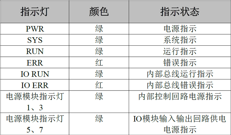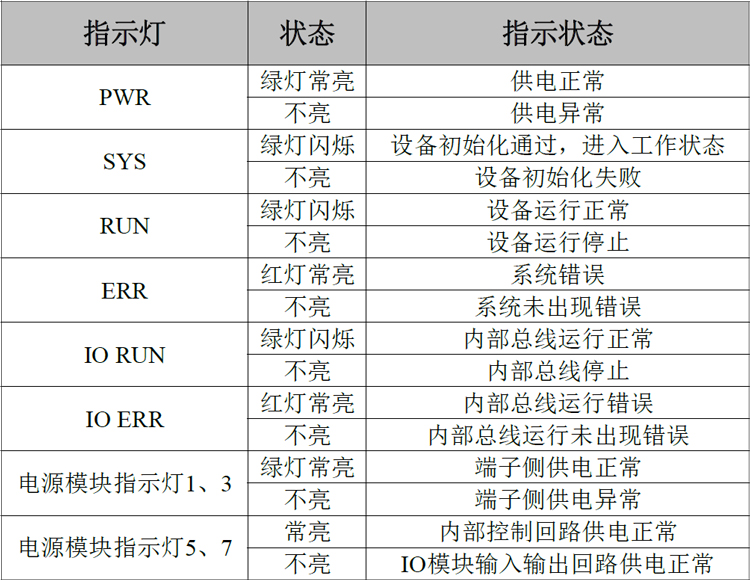 GCAN-PLC-510的正面突出区域包含6个圆形状态指示灯。指示灯的具体指示功能见表2.4。指示灯处于不同状态下时,GCAN-PLC-510的状态如表2.5所示。