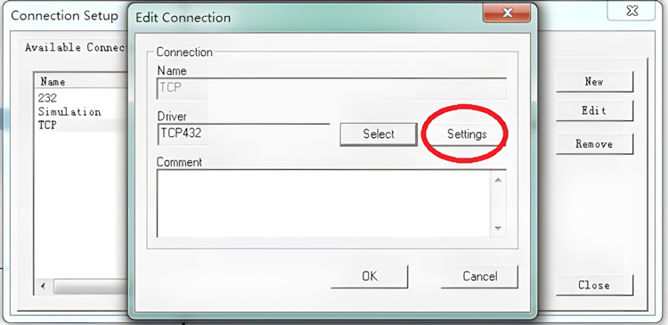 5、Driver 中会显示“TCP432”字样,点击“Settings(设置)”按钮。