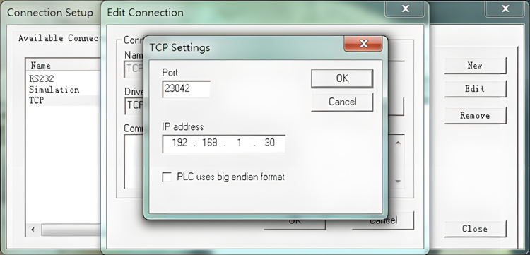 6、Port(端口)请输入23042。IP 地址为192.168.1.30,设置好后点OK