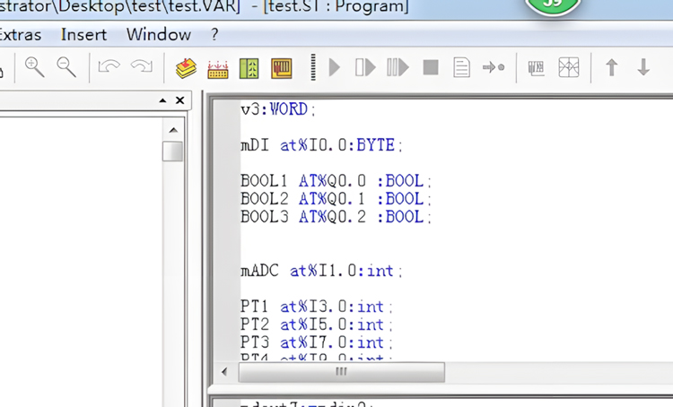 完成变量定义后便可在下方的编程界面开始编程了,下面为用ST 编写的简单例程语句: